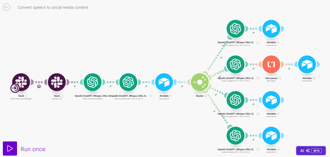 The automation starts by transcribing a voice recording from slack channel and generating content based on the content of the voice recording using ChatGPT. The content is streamlined to each social media platform (Facebook, Instagram Reel, Instagram Post, Linkedin, and X). The generated content are then saved in an Airtable sheet for proofreading and editing.