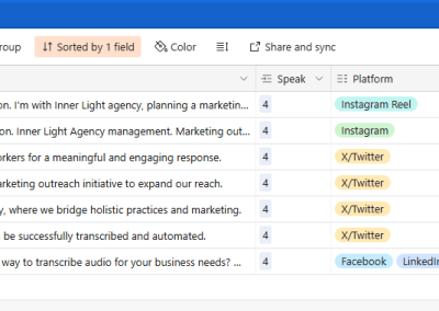 Phase one starts with a voice recording in slack. Record your content idea and key points in a message and send it to a prepared slack channel. Connect the channel to ChatGPT for transcription and converting the idea into a powerful social media content. The generated content is generic and not streamlined to a particular content, but it is detailed and information and only a few prompt away to be transform into content suitable for various social media platforms. This generated content is stored in airtable, waiting to be converted to social media content formats.