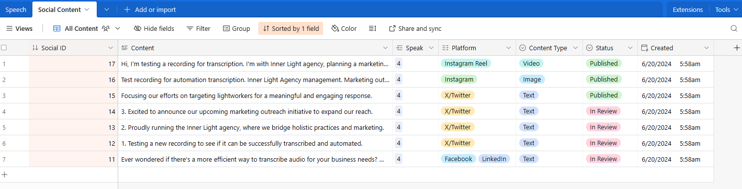 The prompt continues by converting the generic content into series of platform-specific social media content. The automation stores the contents in airtable, specifying which platform the content is created for.